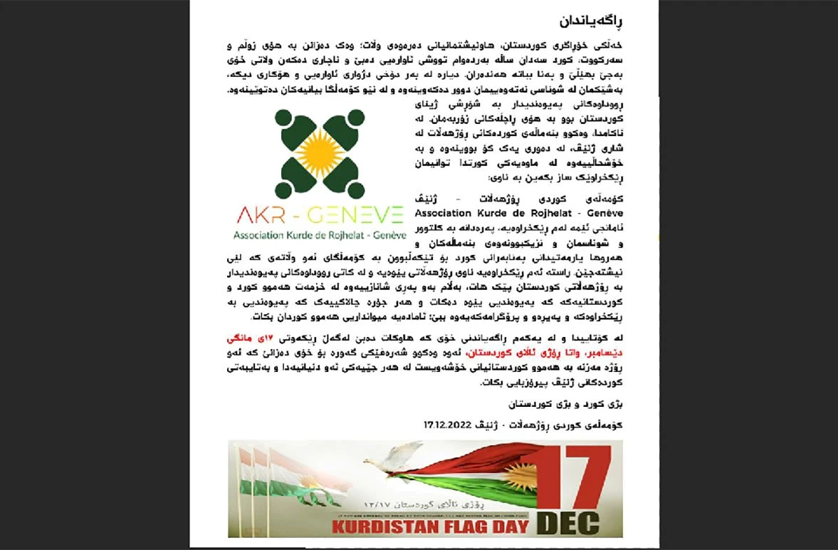 ڕۆژی ١٧ی دێسامبری ٢٠٢٢ هاوکات لەگە ڕۆژی ئاڵای کوردستان، ڕێکخراوەیەک بۆ کوردەکانی دانیشتووی شاری ژنێڤ لە وڵاتی سوئیس ڕاگەیەندرا.